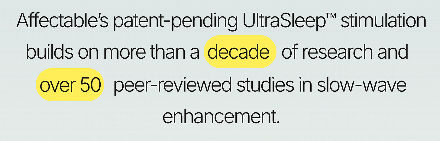 Affectable has engineered precise neurostimulation, crafted the world’s most capable and comfortable EEG headband, and designed an entire system that fits into your life, and takes care of your sleep and health on your behalf with minimal input from you.